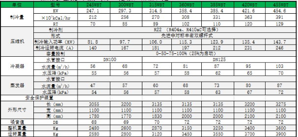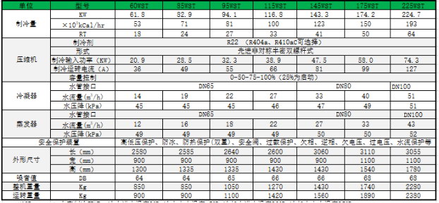 1.上表制冷工況:冷水進(jìn)水溫度--0℃,冷水出水溫度-5℃,冷卻水進(jìn)水溫度30℃,冷卻水出水溫度35℃;