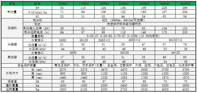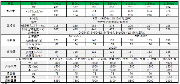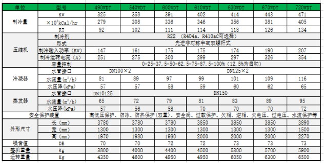 1.上表制冷工況:冷水進水溫度-10℃,冷水出水溫度-15℃,冷卻水進水溫度30℃,冷卻水出水溫度35℃;