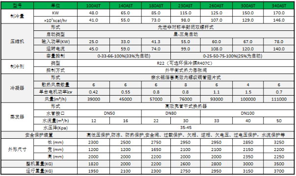 1.上表制冷工況:冷水進水溫度-0℃,冷水出水溫度-5℃,環境溫度35℃;